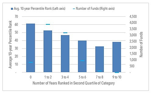 It’s true that the more often funds landed in the second-quartile in the calendar years, the better their long-term returns tended to be, as shown below. But there just weren’t that many funds like that — only 144 finished seven or more calendar years in the second quartile.