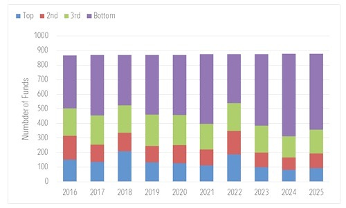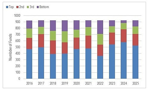 So what I did was pull each fund’s calendar-year returns for the 10 years that made up the decade — 2016 to 2025. Then I sorted funds into quartiles based on their returns in a given calendar year compared to their category peers.