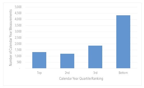 In all, the worst-performing funds over the decade ended Dec. 31, 2025 finished in the top-quartile of funds in their Morningstar Category in a given calendar year only about 15% of the time whereas they landed in the bottom-quartile nearly half the time. That’s more or less the inverse of what we saw for the top-decile funds.