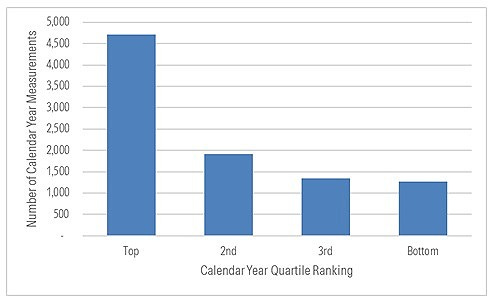 As you move from the best performing funds (on the left) toward the worst performers (right), the share of top-quartile calendar-year ranks shrinks while third- and fourth-quartile finishes swell. It seems only to reinforce the reality that the funds that with the best performance over the decade ended Dec. 31, 2025 excelled most often over these shorter periods and the opposite for funds that underperformed.