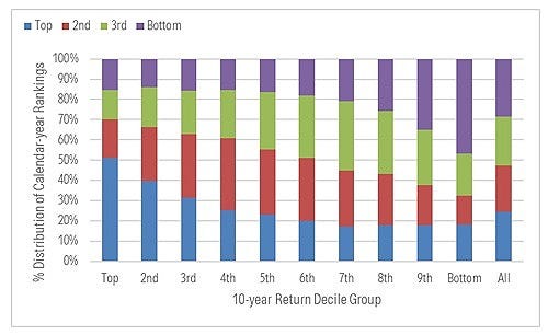 The upshot: Given how utterly unpredictable these shorter intervals are, and how pivotal they appear to be to longer-term elite performance, it’s a fool’s errand to try to handicap which funds will rank near the very top of their peer group 10 years hence. Stick with what you can count on—such as the persistence of fee differences between funds—and that should yield a more-than-acceptable result.