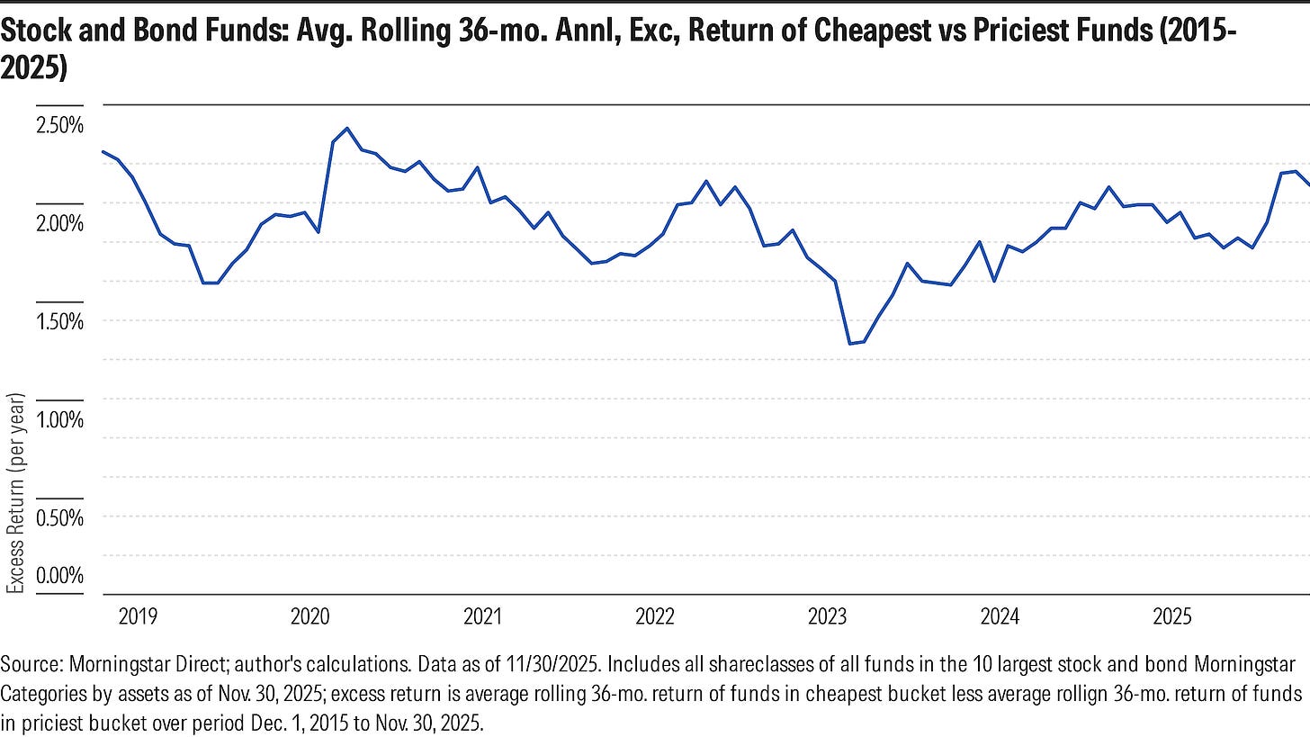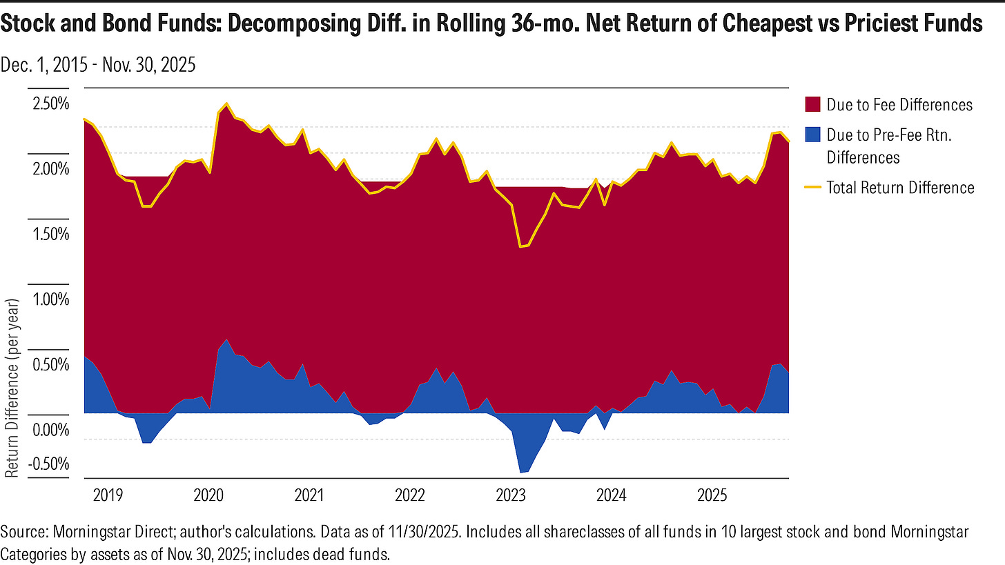 From there, what I thought I’d do is try to estimate how much of cheap funds’ outperformance stemmed from the fee advantage itself versus differences in pre-fee returns. To that end, I focused on the cheapest and priciest buckets, comparing their rolling average 36-month returns over the decade ended Nov. 2025.