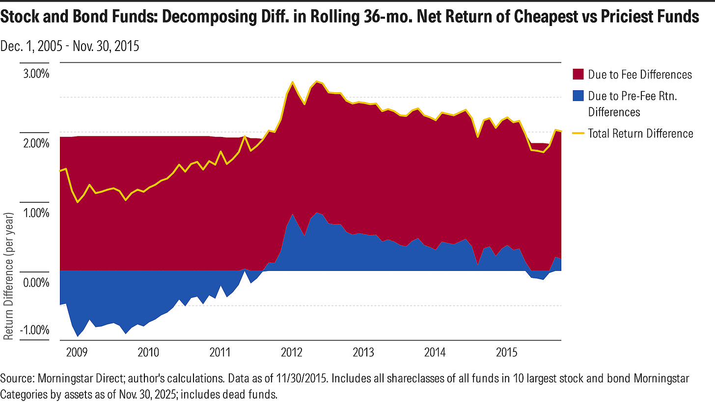 The ‘whatever was left over’ component—namely, differences in pre-fee returns (the blue)—was a much bigger factor in explaining the overall return difference in the prior decade. Put another way, while fees were predictive then, they weren’t as decisive as they’ve become in recent years. That is, fees appear to be getting stronger as a predictor of differences in funds’ performance.