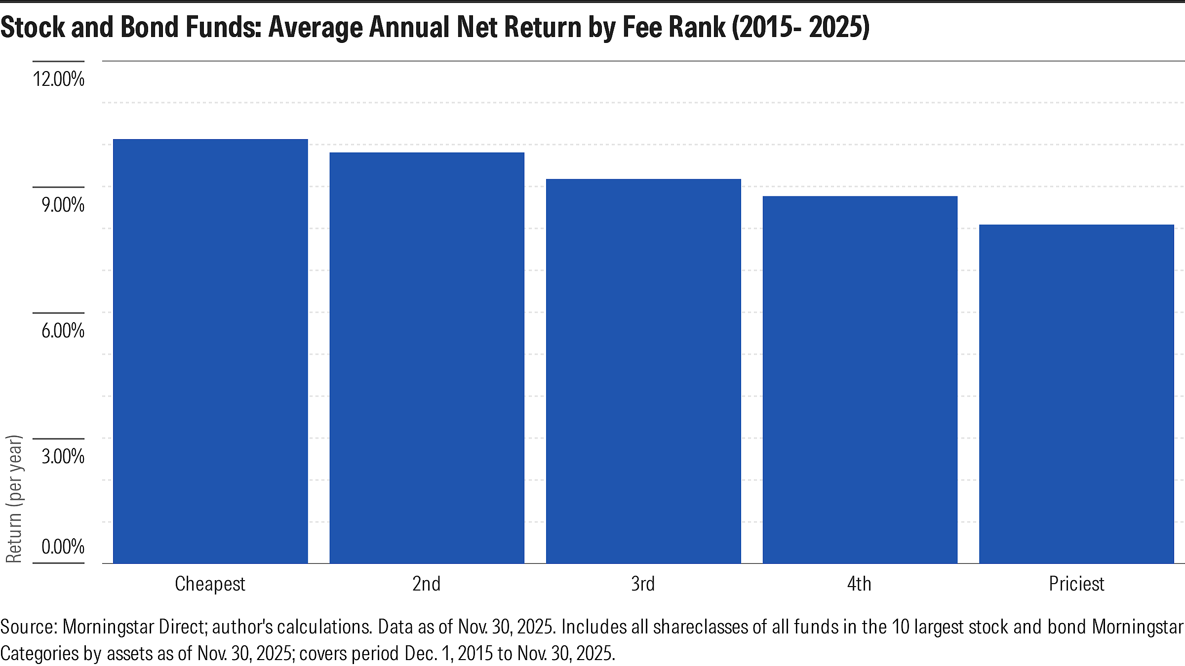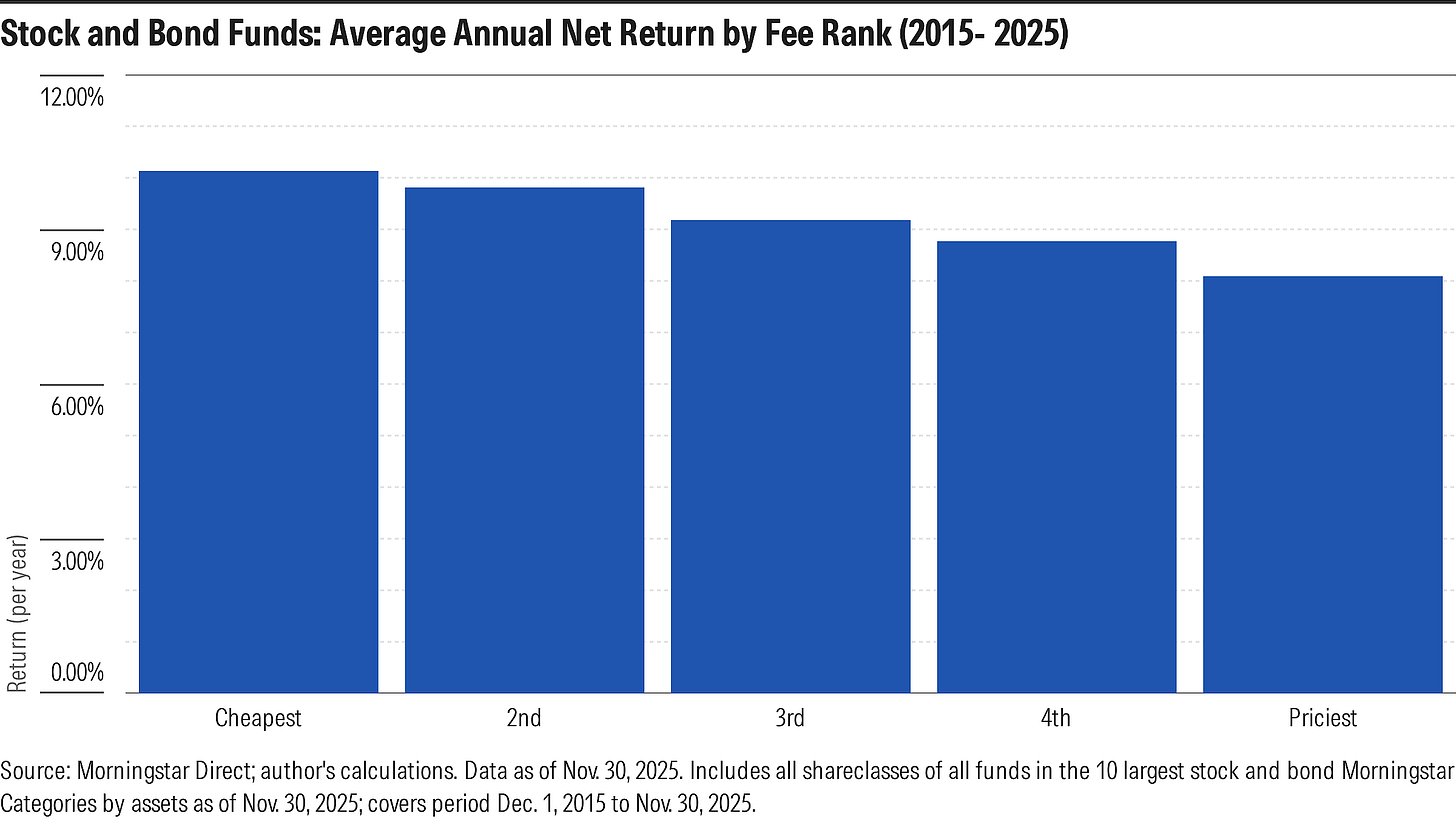 Here’s a chart showing the average performance of stock and bond funds that I ranked by expense ratio and assigned to buckets based on those ranks (cheapest 10%; next 22.5%, middle 35%; next 25%, and priciest 10%). The fee ranks were done versus category peers so the buckets should be cross-sectionally consistent, apples-to-apples. This covers the 10 years ended Nov. 30, 2025.